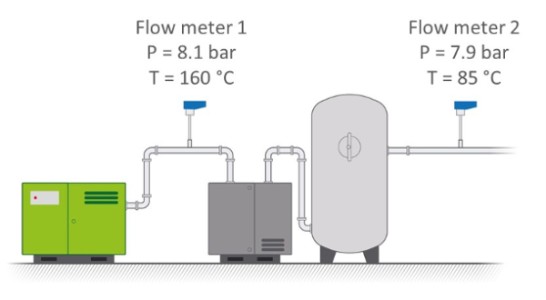 It is likely you have multiple flow meters installed in your plant. For example, one near the compressor and another one in the production hall. How do you compare the results between the two flow meters? After all, the pressure and temperature differ, as is shown in this graphic. Your action depends on which kind of flow meter you have.