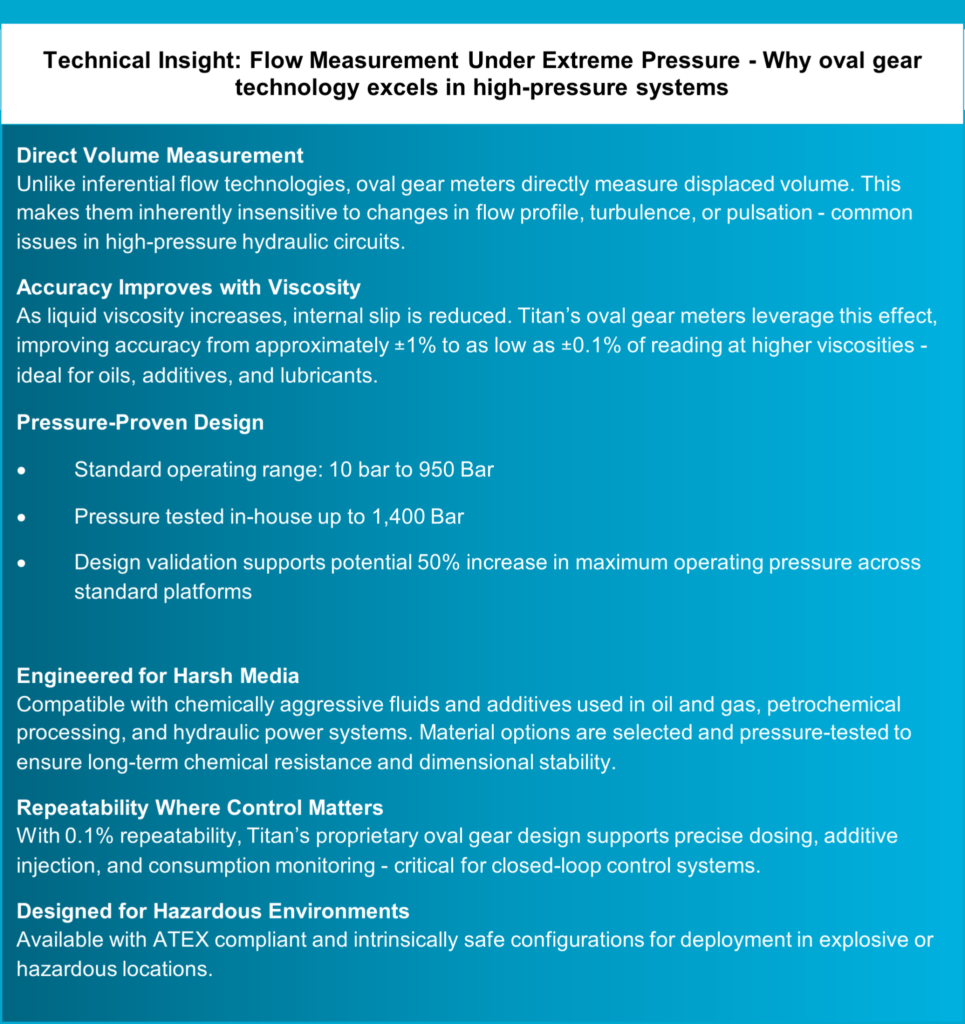 Titan Enterprises designs its high-pressure Oval Gear flow meters specifically for environments where operating conditions push components to their limits. These meters deliver stable, repeatable measurement across extreme pressures, fluctuating viscosities, and chemically aggressive fluids – conditions that quickly expose the weaknesses of less robust technologies.
