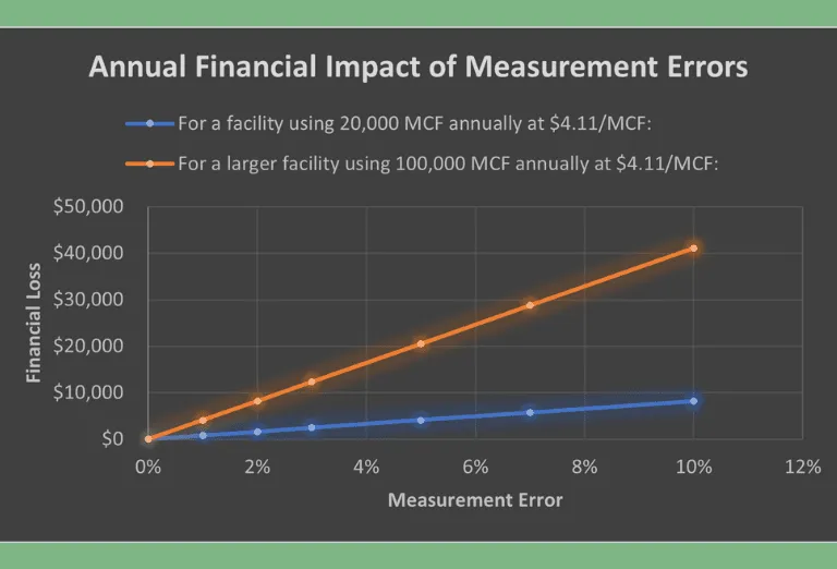 Consider a typical manufacturing facility using natural gas for process heating. With an annual consumption of 20,000 MCF at today’s industrial rates of approximately $4.11/MCF (according to the latest EIA data), the facility spends about $82,000 yearly on natural gas. A modest 3% measurement error means they’re wasting $2,466 annually on the gas.