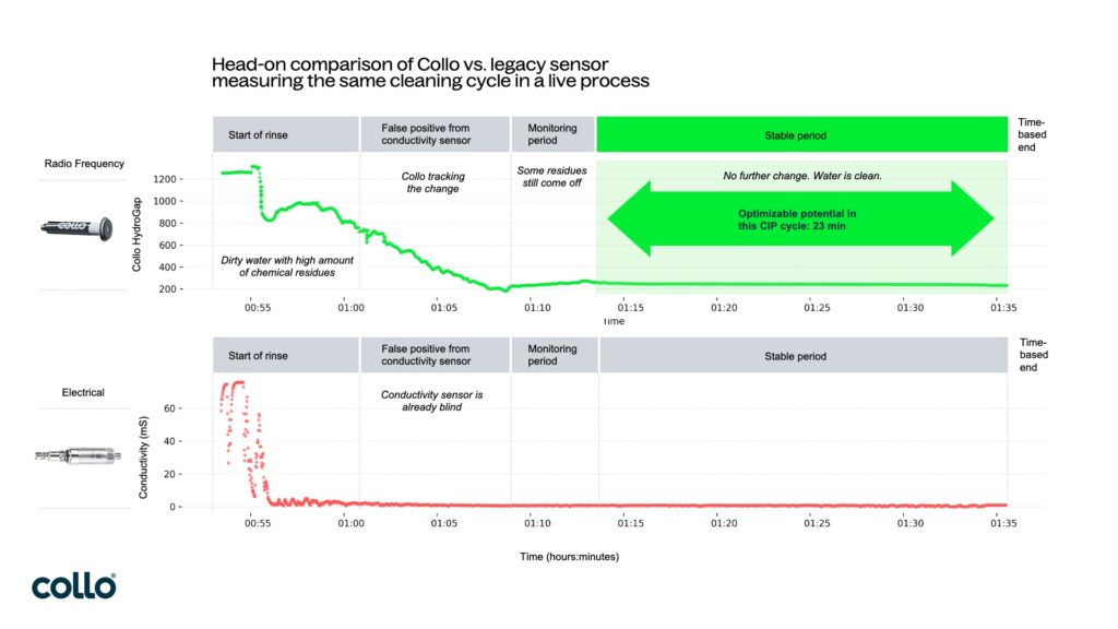 Recent data from a high-capacity beverage facility demonstrates that Colloās liquid process technology revealed an optimizable potential of 23 minutes per cleaning cycle. Unlike a legacy electrical sensor that only measures conductivity, Colloās analyser identifies the exact moment a line is clean.