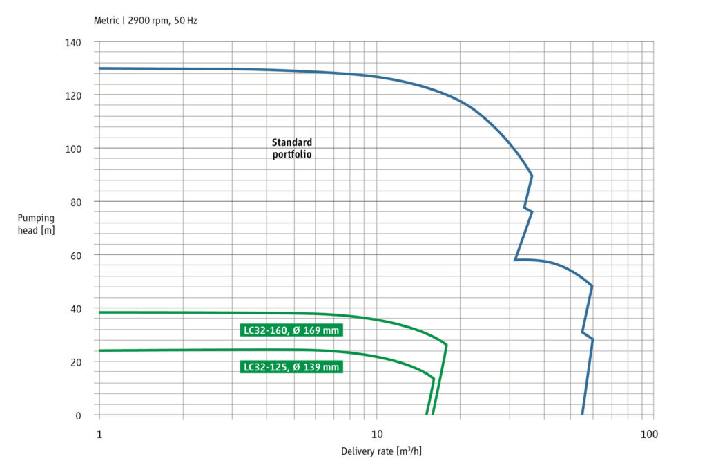 For the project described, the LC32-160 AGX3.0 pump was selected with a motor of 3 kW, a maximum delivery rate of 320 l/min and a maximum pumping head of 38 m. To meet the high demands on corrosion and fire protection, a 3-coat finish was specially applied for railway use and the base was made of stainless steel. This meets the highest requirements of EN 45545-2 for fire protection and DIN EN ISO 12944-5.