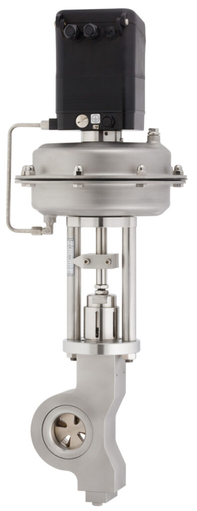 There are two main reasons for the compact size and low weight of sliding gate valves. Firstly, the valves have an intermediate flange design, which is why the body is significantly smaller compared to other control valve types. Secondly, they use smaller actuators because sliding gate valves only require around 10% of the actuating force of a comparable globe valve. The underlying functional principle makes such performance possible: two slotted sealing discs that slide on top of each other to open up the flow cross-section. The actuator only has to cope with the low static and sliding friction between the sealing discs and a short valve stroke of 6 – 9 mm. This ensures short actuating times and permits fast control dynamics.